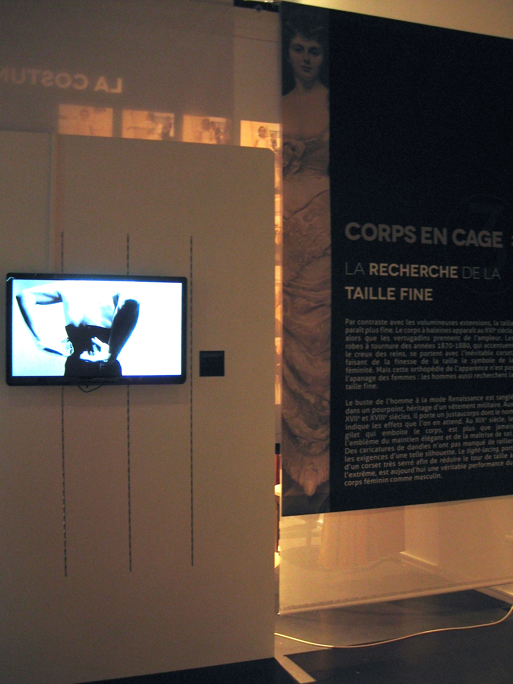 Overview of the "Plein les yeux" exhibition at Calais lace museum, screening a short fashion film with Gabriel Moginot lacing himself in a corset.
